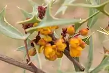 Berberis trifoliolata is a species of flowering plant in the family Berberidaceae, in southwestern North America. Common names include agarita, agrito, algerita, currant-of-Texas, wild currant, and chaparral berry. [3] The name Agarita comes from the Spanish verb agarrar, which means "to grab". The ending "-ita" is often added to little things, so agarita means "grabs a little". This was probably said because the bush is a bit scratchy but does not have significant spines.[3] Typical characteristics are grey-green to blue-grey leaves, yellow flowers in February to April and the red berries appearing in May. The most important harvest organ are the berries, though the roots and seeds can also be used.[4]