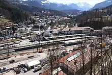 Berchtesgaden Hauptbahnhof (German for Berchtesgaden main station; sometimes translated as "Central Station"[2][3]) is a railway station in the Bavarian market town of Berchtesgaden, the smallest town in Germany with a Hauptbahnhof. It has five platform tracks and is classified by Deutsche Bahn as a category 5 station. It is the terminus of the Freilassing–Berchtesgaden railway. Previously the Berchtesgaden–Hangender Stein railway, also called the Grüne Elektrische (“Green Electric”) started from the station. Within walking distance of the station (Triftplatz) was the former station (Königsseer Bf) of Königssee Railway (German: Königsseebahn), which served the lake of Königssee. The station is served by about 20 trains daily operated by Deutsche Bahn and the Berchtesgadener Land Bahn.