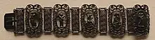 The roots of Berlin iron jewellery in Berlin can be traced back to the establishment of the Königliche Eisengiesserei bei Berlin or Royal Berlin Foundry in 1804.[2] The Royal Berlin Foundry started with the production of iron goods such as vases, knife stands, candelabra, bowls, plaques and medallions, as well as more commercial articles such as fences, bridges and garden furniture. The first jewellery items, such as long chains with cast links, were produced in 1806. Later, necklaces consisting of medallions and joined with links and wirework mesh were manufactured.[1] When Napoleon took Berlin in 1806, the moulds appear to have been taken back to France, where further production took place for some years.[3]