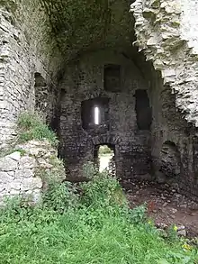 Located about 3 miles from Edenderry town, Carrick Castle is a tall square tower which in its original condition would have been 90 feet long and 32 feet in length. This was the castle built by Sir Pierce Bermingham in the 13th century and is the site of the O'Connor massacre. The view from Carrick is very impressive and its elevation, as with Carbury would have been used as a strong means of defence. Unfortunately it is in very poor condition with only two main walls remaining. However, some of the detail is still visible as in the window and chimney detail. To the left of Carrick is an abandoned church and graveyard.
