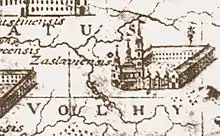 The period between 1550 and 1650 is considered the "Golden Age" of the Polish–Lithuanian Commonwealth (formed in 1569 by the union of the Kingdom of Poland and the Grand Duchy of Lithuania).[1][2] It was a period of economic prosperity due to the grain trade.[3] Foreign trade in grain occupied a key position in the trade conjuncture of the Zaslav region, the leading role in the market held by the owners of the property princes (knyaz) Zaslavsky. The grain collected from the Volyn holdings was transported to Danzig or another port from where it was sold to the Netherlands, England, France, Italy, and Spain.[4] The construction of the monastery complex in Zaslav was taking place at the same time as the implementation of another rather costly project – the construction of the church of John the Baptist. It was also a time of religious tolerance as a result of the decisions of the Warsaw Confederation (1573),[5] but also the time of Catholic counter-reformation.[6] At the time of the allotment of the land for the construction of the Bernardine monastery, Prince Janusz Zasławski professed Calvinism, and his wife, Alexandra Sangushkivna, belonged to the anti-Trinitarians. Their son Prince Alexander Zaslavsky, a Catholic, who had a conflict with the Bernardines, completed the construction of the monastery.[7] Zaslav was a multinational (Ruthenians, Hebrews, Poles, Tatars) and a multi-denominational (Orthodox, anti-Trinitarian, Calvinist, Greek Catholic, Catholic, Jewish, Muslim) city. During this period, new trends in architecture and urban planning were introduced on the Ukrainian lands, introduced by visiting European construction workers, mostly Italians. The erection of the complex of the monastery in the newest style of Mannerism and Late Renaissance lights is associated with the construction activity in the exile area of architect Jakub Madeline, originating from Graubünden, land on the Italian-Swiss border.[8][9]