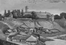 Ostrog Gate played the role of the main gate of the monastery from the northwest. Now the remains of the walls of the first tier are included in the prison fence from Gagarin Street. In stylistic terms, it belongs to the works of architect Paolo Fontana and recalls his other works: the belfry of the parish church in Ostrów Lubelski and the bell tower of Bernardine church in Jelenec.[19] In the lower tier there was placed spacious entryway with annexes on the sides. In the upper tier there was a room illuminated through rectangular windows. The building was covered with a tiled roof with a dormer. The nares are emphasized by pilasters.