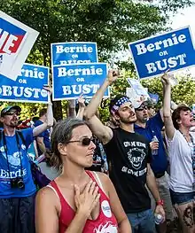 Sanders supporters organized various demonstrations in support of his campaign. They are known to have participated in large numbers in the Donald Trump Chicago rally protest[108] and the Democracy Spring protests.[109] On April 3, a large number of Sanders supporters protested in front of CNN Headquarters in Los Angeles, demonstrating against the amount of airtime Sanders received in comparison to other candidates.[110]