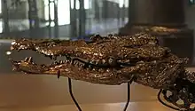 At only 60 centimetres (2.0 ft) in length, Bernissartia is one of the smallest crocodyliforms that ever lived.[2] It resembled modern species in many respects, and was probably semi-aquatic. It had long, pointed teeth at the front of the jaws that would have been of use in catching fish, but broad and flat teeth at the back of its jaws that were suited for crushing hard food, such as shellfish, and possibly bones.[3]