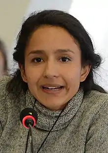 When Zúñiga Cáceres was three, her mother founded COPINH, with her father as one of the original members.[2] The organization is dedicated to the defense of the rights of the Lenca people and the defense of the environment, two of her mother's great passions, along with combatting sexual discrimination and the oppression of women and LGBT communities, all issues Berta Cáceres saw as interconnected.[3] COPINH from the start had many detractors, which contributed to a turbulent early life for Zúñiga Cáceres, whose family experienced death threats, physical assaults, and the imprisonment of Zúñiga.[2][3] Zúñiga Cáceres grew up joining in the activities of COPINH with her family.[5][6] Like her siblings, after a brief period in regular schools, she attended popular education schools, where she received anti-capitalist and anti-patriarchal training.[2] She graduated from college in Cuba before beginning to work towards a master's degree in Latin American Studies in Mexico City.[3]
