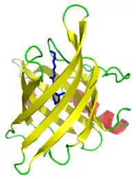 8-strand β barrel. Human retinol-binding protein bound to retinol (vitamin A) in blue. (PDB: 1RBP)