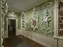 Katleman's work addresses dualities[5] between nature and culture; order and chaos; kitsch and fine art; dark humor and optimism; consumption and desire.[6][7] Her sculpture is informed by parallels and differences between classic European decorative arts and American pop culture.[2] The objects that she casts into sculpture are sourced from dime store trinkets, gadgets, dolls and toys.[7] Katleman is influenced by porcelain rooms, such as The Royal Palace of Aranjuez in Spain;[8] Toile de Jouy wallpaper found in Versailles and the Victoria and Albert Museum;[9] and time studying Italian porcelain reliefs in the Salottino di Porcellana room at the Royal Palace of Capodimonte, Naples, which she visited during an artist residency at the American Academy in Rome.[10]