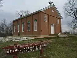 Bethel Church (also known as New Bethel Church or Bethel Methodist Church) is a historic Methodist church located on Missouri Highway T near Labadie, Missouri. The church was built in 1868 to replace a log building constructed in 1840 for Franklin County's first Methodist congregation. The red brick building has an unornamented Greek Revival design. The building has a Greek temple form with a low gable roof and square brick pilasters flanking the door and separating the large side windows. The interior of the church has a high ceiling, a balcony above the narthex, and white-painted features.[2]
