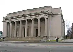 The Kahn-designed temple is a classical, flat-roofed structure built from limestone.[2] On the facade facing Woodward, eight ionic columns form an enormous porch and frame three large pairs of doors. Along the facade facing Gladstone, eight tall, narrow are framed by massive piers.[2]
