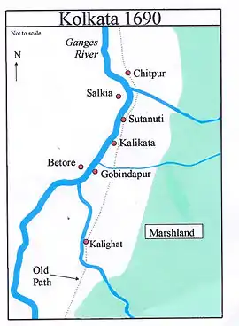 In addition to the three recognised hamlets, Sutanuti, Gobindapur and Kalikata around which the city of Kolkata has grown up, must be added at least four others as the elementary constituents of the city (including Howrah on the opposite bank). These are Chitpur, Salkia, Kalighat and Betore. Out of these four Betore, which was the focus of trade once upon a time, vanished in the seventeenth century.[1]