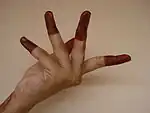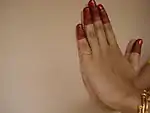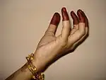 Lastly, all dancers outline their hands and feet with red kumkum powder or alta, a tradition that helps the audience easily see their hand and foot gestures.[91]