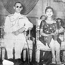 Other disused ceremonies from the classical period of the Chakri Dynasty, such as the royally patronised ploughing ceremony (Thai: พิธีพืชมงคล), were also revived.[46] Bhumibol's birthday (5 December) was declared the national day, replacing the previous national day, the anniversary of the Siamese revolution of 1932 (24 June).[47] Upon Sarit's death on 8 December 1963, an unprecedented 21 days of mourning were declared in the palace. A royal five-tier umbrella shaded his body while it lay in state. Long-time royal adviser Phraya Srivisaravacha later noted that no Prime Minister ever had such an intimate relationship with Bhumibol as Sarit.[48]