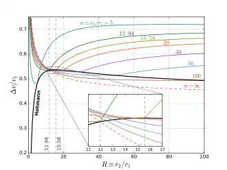 One sees that the Hohmann transfer is always more efficient if the ratio of radii is smaller than 11.94. On the other hand, if the radius of the final orbit is more than 15.58 times larger than the radius of the initial orbit, then any bi-elliptic transfer, regardless of its apoapsis radius (as long as it's larger than the radius of the final orbit), requires less than a Hohmann transfer. Between the ratios of 11.94 and 15.58, which transfer is best depends on the apoapsis distance . For any given in this range, there is a value of above which the bi-elliptic transfer is superior and below which the Hohmann transfer is better. The following table lists the value of that results in the bi-elliptic transfer being better for some selected cases.[4]