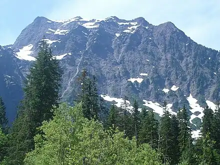 Big Four is a 6,160+ feet (1,880+ m) mountain summit in the Cascade Range, located about 20 miles (32 km) east of Granite Falls, Washington. It is situated 4 miles (6.4 km) west of Barlow Pass along the Mountain Loop Highway, near the Monte Cristo area, on land administered by the Mount Baker-Snoqualmie National Forest. Debris piles on the mountain's northern flank form as a result of avalanche activity. These fields of disturbed snow are able to remain year round in the shadow of the mountain. During the summer months snow-melt streams flow beneath the debris piles and cause caves to form in the ice. The caves vary in size from season to season and are unpredictably dangerous. The mountain is open to the public and a large snowfield can be reached by a short trail, but the snowfield itself is off-limits due to cave-ins and slides which have killed hikers in incidents in 1998, 2010, and 2015.[5][6]