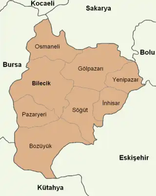 Bilecik Province (Turkish: Bilecik ili) is a province in midwest Turkey, neighboring Bursa to the west, Kocaeli and Sakarya to the north, Bolu to the east, Eskişehir to the southeast and Kütahya to the south. Its area is 4,179 km2,[2] and its population is 228,673 (2022).[1] Most of the province laid down in Marmara Region but eastern parts of Gölpazarı and Söğüt district and districts of İnhisar and Yenipazar remained in Black Sea Region, smaller southeastern parts of Bozüyük and Söğüt remained in Central Anatolia Region and smaller southwestern part of Bozüyük remained in Aegean Region.