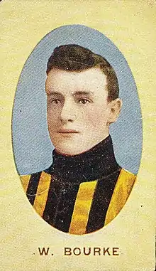 Bourke had the distinction of topping Richmond's goal-kicking in their first two VFL seasons, in 1908 and 1909, with 25 and 20 goals respectively.[3][4] He along with family members was a strong Collingwood supporter and actually first tried to play for Collingwood. Upon being denied a game as a Magpie he decided to play with Richmond who were just entering the VFL. He retired after just two seasons to drive a taxi as it paid more than his wage as a footballer. He later ran a boot factory, which employed many league footballers and was the largest in the southern hemisphere at the time. He died suddenly of a heart attack in 1932 leaving a family of six children behind.[5]