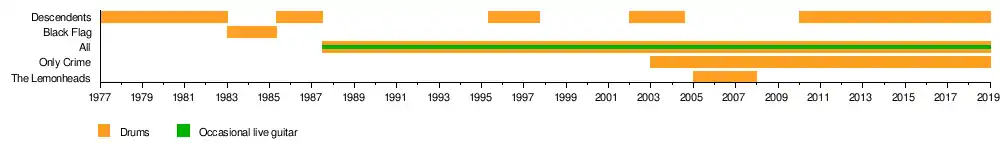 Stevenson is an original member of the Descendents forming in 1978. The Descendents put out a single called "Ride the Wild / It's a Hectic World" in 1979. In 1982 they put out their first album Milo Goes to College. After the album, singer Milo Aukerman went to college, the band played rarely, so Stevenson joined Black Flag. He left Black Flag in 1985 to reform the Descendents. The Descendents became All in 1988 after Aukerman left once again. The Descendents would form again from 1996 to 1997 and then in 2002, before going on hiatus. From 2003 to 2007, Stevenson played in smaller bands until All played shows again in 2008. In 2010, the Descendents reformed again.[8]