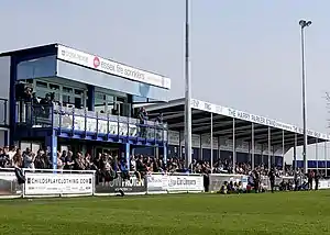 In 1980 a permanent 120-seat stand was built between the Cowshed and the clubhouse; its shape led to it becoming known as the Pacman stand.[13][14] During the 1980s a 200-seat stand was built on the side that had previously hosted the temporary seating, with the supporters club erecting several small areas of terracing.[13] In 1995 Billericay bought two stands that had been in use at Newbury Town's Faraday Road ground after the club went bust. One was installed next to the Cowshed and the other at the Blunts Wall End, with seats later installed in the Blunts Wall End stand.[13] The new stand adjacent to the Cowshed was soon moved to the other end of the pitch.[13] An area of covered terracing was added alongside the 200-seat stand.[14] Chelmsford City groundshared at New Lodge between 1998 and 2005.[17] In 2002 the club announced plans to move to a new 4,000-capacity stadium at Gloucester Park. However, the relocation was scrapped by new chairman Steve Kent in 2004.[18] By the summer of 2017 the ground had a capacity of 3,500, of which 424 was seated and 2,000 was covered.[16]
