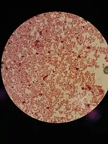 B. wadsworthia is a Gram-negative, catalase-positive, and usually urease-positive bacterium.[2] Although most strains are urease positive, there are some strains that are urease negative. This bacterium is approximately 0.7 μm wide by 1.0–10.0 μm long in colony and the cells are pleomorphic with irregular cell walls.[3][4] B. wadsworthia, due to its slow nature to grow in standard media for anaerobes, is often misidentified as other anaerobes or not identified at all.[2] The best identifier for this bacterium is a transparent colony with a black center in BBE agar; the black center is ferrous sulfide, which is created by the hydrogen sulfide the bacteria produces.[2][4] Another unique characteristic of B. wadsworthia is its positive catalase reaction with a 15% hydrogen peroxide reagent; its catalase reaction is unlike other catalase-positive species because the reaction is explosive with bubble formation and is very quick.[5] The most accurate method to identify this bacterium from other similar species is through gas liquid chromatography (GLC); GLC results show that there are a lot of acetic acid peaks and minimal succinic acid present. B. wadsworthia is non-motile and is non-spore forming.[3] In addition, this bacterium has irregular cell walls and no flagella attached to it. The two factors that stimulate its growth are bile and pyruvate; specifically, 20% bile and 1% pyruvate.[4]