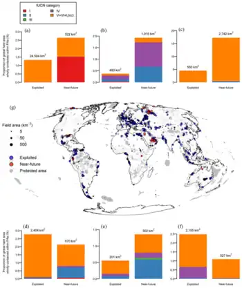 Fossil fuel extraction and associated oil and gas pipelines have had major impacts on the biodiversity of terrestrial, freshwater, coastal and marine environments due to land conversion, habitat loss and degradation, contamination and pollution. An example is the Western Amazon region.[136] Exploitation of fossil fuels has had significant impacts on biodiversity also through climate change following combustion of these fuels.[137] Protected areas with rich biodiversity have been mapped out and many are located in areas containing unexploited fossil fuel reserves worth between 3 and 15 trillion USD (2018).[137]