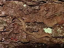 Bipalium pennsylvanicum, the three-lined land planarian, is a species of land planarian in the subfamily Bipaliinae.[1][2] They are native to Asia, but found mostly in Pennsylvania and the surrounding areas.[3][2] They can reach a length of 5.1 inches (130 mm) or more, with a diet consisting mostly of earthworms. They reproduce sexually by creating a cocoon in the spring, but unlike related planarians, they cannot reproduce through binary fission.[2] It is not recommended to touch these flatworms without gloves, because their mucous contains a toxin that is used for digesting prey and can cause skin irritation for some people.[4]