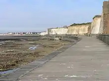 The village is built beside four partly sandy bays; Minnis Bay to the west, Grenham Bay and Beresford Gap towards the centre and Epple Bay to the east. The village is situated on the Isle of Thanet, which was a separate island from mainland Kent until around two hundred years ago, when the channel in between became silted up. The area to the west of the village, between Birchington and Herne Bay, was once part of the channel and is now low-lying marshland. In the east of the village the land rises, forming chalk cliffs and cliff stacks around the beaches at Grenham Bay, Beresford Gap and Epple Bay. A sea wall stretches along the foot of the cliffs to prevent further erosion. The geology of Thanet consists mainly of chalk,[8] deposited when the area was below the sea. Isle of Thanet became exposed above sea-level once the English Channel broke through between Kent and France, causing the sea-level to fall. The whole of the northeast Kent coast has been designated a Site of Special Scientific Interest.[9]