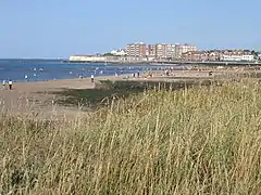 Minnis Bay is a popular family beach with attractions such as sailing, windsurfing, cafes, beach huts, public houses, restaurants, a children's playground, a paddling pool and coastal walking/cycling routes. The beach has gained a European Blue Flag Award for its cleanliness and safety.[23] The village has three other smaller beaches, which are surrounded by chalk cliffs and cliff stacks. Wildlife that can be observed in the Thames Estuary includes seals, velvet swimming crabs and the migrant turnstone.[24]