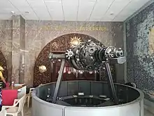 The planetarium is equipped with a versatile opto-mechanical GOTO GM II starfield projector,[6] an accompanying special-effects projector and an X-Y table system for simulating various celestial phenomena. The GM II projector has the provision to execute the diurnal, annual, latitudinal, and precessional motions. The pierced hemispherical inner dome of the planetarium, made of aluminium, is 15 m in diameter. The air-conditioned theatre has a seating capacity of 236.