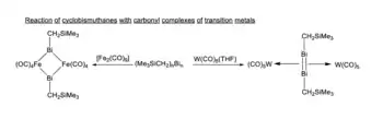 The common synthetic precursor is the trimethylsilylmethyl-cyclobismuthane. Upon reaction with tungsten pentacarbonyl, the resulting side-on adduct preserved the dibismuthene unit, while reaction with diiron noncarbonyl yields the a tetracylic heteronuclear iron-bismuth carbonyl compound (see scheme to the right).[9][10]