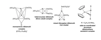 The complexity of the dibismuthene complexes ranges from incorporation of cobalt ions to generate a prismatic cobalto carbonyl dicapped structure in the [(CO)11Co4Bi2]- structure to iron incorporation to yield diiron dibismuth tetracyclic moiety side-on capped with cobaltocarbonyl unit.[11][2] A similar structure was synthesized with tungsten replacing the iron units and this time capped with a bismuth-iron carbonyl-Cp'' unit.[2] Finally, another example comes in the form of a side-on coordinated zirconium dicyclopentadienyl unit to the dibismuth mesitylene moiety (see figure).[12]