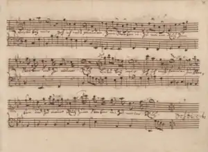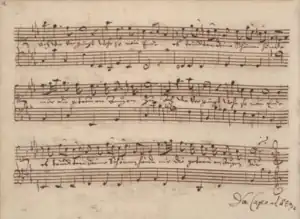 Early July 1733, Bach was still completing the composition, and the performance parts he intended to send to Dresden.[27] Around this time, there are the earliest documented signs he used cantatas composed by Stölzel for performance in Leipzig.[28] He may have performed two cantatas from Stölzel's Namebook cycle, for the fifth and sixth Sunday after Trinity, in July 1733: his copies of these cantatas date from around this time.[28] He performed Stölzel's Ein Lämmlein geht und trägt die Schuld on Good Friday 23 April 1734, and likely Stölzel's entire String-Music cantata cycle from 1735 to 1736.[6][7][29][30] Around the same time, that is, likely somewhere between 1734 and 1740, Anna Magdalena Bach entered a version for voice and continuo of "Bist du bei mir", an aria from Stölzel's 1718 Diomedes opera, in her second notebook.[2][6][9][31]