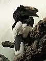 The black-and-white-casqued hornbill (Bycanistes subcylindricus) also known as the grey-cheeked hornbill, is a large black and white hornbill. It has an oversized blackish bill with a large casque on top. The female is slightly smaller than the male and has a significantly smaller casque. It is a monogamous species, and pairs nest in suitable tree cavities. The female usually lays up to two eggs. The diet consists mainly of figs, fruits, insects and small animals found in the trees.
