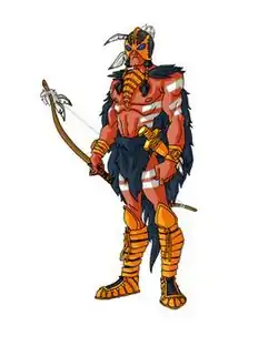 He carries a spear, which he spins to perform certain mystic feats such as cleansing negative magical energies. He also carries an ordinary longbow, arrows, and knife. He wears a pouch containing mystic herbs he can employ for various purposes, involving his knowledge of mystic rituals.