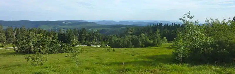 The greater part of the Ruhestein area extends reaches a height of approximately 1,150 m above NHN near Dreifürstenstein in the southeasternmost summit region of the Hornisgrinde, the highest mountain in the northern Black Forest. Other summits are the bird's head (Vogelskopf) (1,056 m) and the Schliffkopf (1,054 m) to the west, the Seekopf (1,054 m) in the northwest, the Riesenköpfle (1,001 m) in the centre, the Leinkopf (992 m) in the north and the Großhahnberg (940 m) in the northeast. In this southern part of the National Park are the tarns of Wildsee, Huzenbacher See and Buhlbachsee and the upper Schönmünz valley and the headwaters of the Murg headstreams, the Rechtmurg and Rotmurg and other Murg tributaries. On the western slopes of the Schliffkopf this subregions extends down as far as the All Saints Waterfalls, where it reaches is lowest and most westerly point at a height of approximately 500 m. Excluded from the Ruhestein area are the Ruhestein itself with its two ski slopes and the Great Ruhestein Ski Jump, the Darmstädter Hut, the Schliffkopf Hotel, the Rotmurg Hunting Lodge, the hamlet of Schonmünz (Volzenhäuser) and other small areas. The state forest land here belongs mainly to the collective municipality of Baiersbronn (in the county of Freudenstadt), other elements belong to Oppenau, Ottenhöfen and Seebach (in the county of Ortenaukreis).[7][8]
