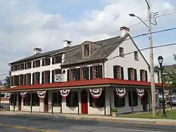Black Horse Inn, also known as Sampson & the Lion, is a historic inn and tavern located in Flourtown in Springfield Township, Montgomery County, Pennsylvania. The original section was built in 1744 and is a 2+1⁄2-story stuccoed stone structure with a one-story, stone kitchen addition in the rear. The original section measures 16 feet by 18 feet, and the kitchen addition 15 feet by 15 feet.