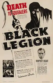 Black Legion is a 1937 American crime drama film, directed by Archie Mayo, with a script by Abem Finkel and William Wister Haines based on an original story by producer Robert Lord. The film stars Humphrey Bogart, Dick Foran, Erin O'Brien-Moore and Ann Sheridan. It is a fictionalized treatment of the historic Black Legion of the 1930s in Michigan, a white vigilante group. A third of its members lived in Detroit, which had also been a center of the Ku Klux Klan in the 1920s.