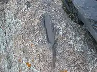 The mountain is composed of two main rock types that are roughly divided between western and eastern halves of the mountain. The west side of the mountain is composed of a ~250 m. bed of meta-sedimentary rock[3] distinguishable as phyllite and argillite. From a distance, the meta-sedimentary rock is easily mistaken for basalt, which is common in the area, however basalt is not found on Black Mountain. The phyllite has a slaty cleavage and is foliated in all directions, a result of shortening due to pressure-solution volume-diffusion of as much as 50%. As a result of shortening, streambeds of nearby washes are filled with black alluvium.