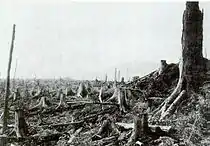 As forests in the north were cut down to meet the growing demand for lumber in the late 19th century, logging firms turned to the virgin forests of Southern Appalachia. Between 1908 and 1912, northern lumber firms, namely Dickey and Campbell (later Perley and Crockett), Brown Brothers, Carolina Spruce, and Champion Fibre, bought up timber rights to most of the Black Mountains and began a series of massive logging operations in the area. In 1911, Dickey and Campbell managed to construct a narrow-gauge railroad line connecting the Swannanoa Valley with Clingmans Peak. Other narrow-gauge lines quickly followed. Between 1909 and 1915, much of the forest on the upper slopes and crest was cut down. An increase in demand for red spruce during World War I led to the rapid deforestation of much of the spruce-fir forest in the higher elevations. As forests were removed, forest fires (caused by the ignition of dried brush and slash left by loggers) and erosion denuded what was left of the landscape.[23]