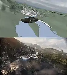 Previsualization (top) and completed visual effects shot of Wakanda by Industrial Light & Magic (bottom)
