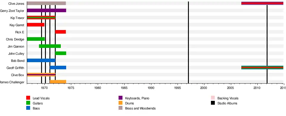 - Clive Jones (aka Clive Beer-Jones; born Clive Alan Jones, 28 May 1949, Leicester, Leicestershire - 16 October 2014, Warwick) - saxophone, flute (1966-1973; 2007-14; his death), keyboards, lead vocals (2007-14; his death)[11]