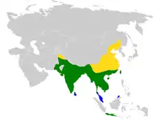 Seven subspecies have been named[12] but the largely contiguous populations show clinal variation and intergrade with each other. Individuals from northern India (ssp. albirictus) are larger than those from the Sri Lankan population minor while those from the peninsular India (nominate subspecies) are intermediate in size.[13] Race cathoecus is found in Thailand, Hong Kong and China.[14] This race has a much smaller rictal spot and the wings are dark with a greenish gloss.[12] In southern Siam a race thai is resident, but overlaps with wintering cathoecus. Race javanus is found on the islands of Java and Bali. Race harterti found in Formosa has the tail length less than the wing.[12]