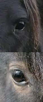 True black horses have dark brown eyes, black skin, and wholly black hair coats without any areas of permanently reddish or brownish hair. They may have pink skin beneath any white markings under the areas of white hair, and if such white markings include one or both eyes, the eyes may be blue. Many black horses "sun bleach" with exposure to the elements and sweat, and therefore their coats may lose some of their rich black character and may even resemble bay or seal brown, though examination of the color of hair around the eyes, muzzle and genitals often will determine color. Black horses that do not sun bleach are called "true" blacks.