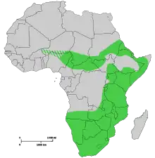 Historical black rhinoceros range (ca. 1700 A.D.).[4] Hatched: Possible historical range in West Africa.[5] | |