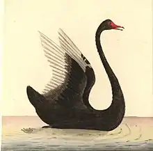 Governor Phillip, soon after establishing the convict settlement some sixty years later and 3,000 kilometres (1,900 mi) away at Botany Bay on the east coast, wrote in 1789 that "A black swan, which species, though proverbially rare in other parts of the world, is here by no means uncommon ... a very noble bird, larger than the common swan, and equally beautiful in form ... its wings were edged with white: the bill was tinged with red."[7] A contemporary, Surgeon-General John White, observed in 1790, "We found nine birds, that, whilst swimming, most perfectly resembled the rara avis of the ancients, a black swan."[7]