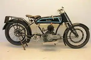 Blackburne motorcycles performed well in the 1913 and 1914 ACU six days trials. Three 499cc Blackburne motorcycles were entered in the ACU six days trial in 1914 one ridden by John Spear Roberts (ex Motosacoche Ltd ), who is named as joint applicant in a Blackburne patent of 1918.[5] In the judges summary of the event they stated that the "Blackburne machines are also worthy of very favourable notice on account of their good engine design".[6] With the outbreak of the war in mid-1914, three directors of Burney and Blackburne Ltd volunteered as despatch riders, these were Cecil Burney, Alec Burney and C.Q. Roberts (also Q.A.Roberts his brother).[7] Reporting back to the Motor Cycle later that year, Alec Burney had lost his machine when it was run over by the heavy artillery during the night. Reporting in November[8] Cecil Burney stated that his Armstrong (hub gears) were standing up wonderfully well, but was adamant that a hand clutch (instead of the common foot clutch) was an absolute requirement. In November 1916 it was reported[9] that the Burney brothers had received lieutenants commissions, Alec running a motor cycle repair base in France, and Cecil running a repair shop for engine-driven electrical lighting units for a signals station.