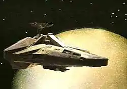 After Gan's death, Blake considers the future of the rebellion, and Travis is convicted of war crimes by a Federation court martial at Space Command Headquarters aboard a space station. Blake decides to restore his group's reputation and attacks the space station but Travis escapes and continues his vendetta against Blake.[28] Blake seeks the new location of the computer control facility. He learns that it is named Star One.[29] When Star One begins to malfunction, Servalan also becomes desperate to find its location. The facility's failure causes many problems in the Federation. Star One controls a large defensive barrier that has prevented extra-galactic incursions. Blake discovers Star One's location and finds that, with help from Travis, aliens from the Andromeda Galaxy have infiltrated it. Vila discovers a fleet of alien spacecraft beyond the barrier. Travis partially disables the barrier. Blake and his crew overcome the aliens at Star One and kill Travis but the gap in the barrier allows the aliens to invade. Jenna calls for help from the Federation, where Servalan has conducted a military coup, imposed martial law and declared herself President. Servalan dispatches the Federation's battle fleets to repel the invaders, who begin to breach the barrier. With Blake badly wounded, Liberator by Avon's direction, alone until Servalan's battle fleets arrive, fights against the aliens.[30]