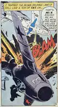 The painting is based on Russ Heath's art in the comic book All-American Men of War issue #89 (January-February 1962), published by National Periodical Publications.[1] The painting depicts a pilot ejecting from an exploding plane.[2] The same issue was the inspiration for several other Lichtenstein paintings, Okay Hot-Shot, Okay!, Brattata, Whaam! and Tex![3] The graphite pencil sketch, Jet Pilot was also from that issue.[4]