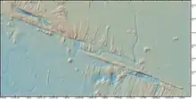 The Blanco Transform Fault Zone is an approximately 350 km long zone that varies in width between 20 and 75 km. The Blanco Fracture Zone starts about 150 km off Cape Blanco, and extends northwest to about 500 km off of Newport.[1] It consists of a series of deep basins interrupted by transform faults. The western part of the fracture zone, from the Cascadia Depression to the Juan de Fuca Ridge, moves at 1.4 cm/a;[2] the eastern segment, from the Cascadia Depression to the Gorda Ridge moves at 3.9 cm/a.[2] The whole zone averages a slip rate of 2.0 cm/a.[3]