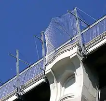 The barrier was called the Luminous Veil.[6] Designed by architect Dereck Revington and engineers at Halcrow Yolles and completed in 2003, the Luminous Veil consists of over 9,000 steel rods, 12.7 cm (5.0 in) apart and five metres (16 ft) high, stretched to cantilevered girders.[13] The tensile structure was difficult to analyze and required several tests at the University of Toronto. Initially, cost prohibited the planned lighting to be installed on the top horizontal member. The lighting installation was completed in July 2015.[14] The Luminous Veil received in 1999 a Canadian Architect Award of Excellence.[15]