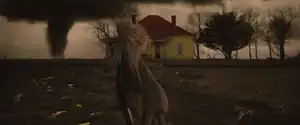 Looking out through the window, she sees that the thunderstorm is getting worse. Fearing a tornado, she leaves her father and runs to the cellar alone to protect herself. She's then seen lying in an old bed and crying as she hears the tornado coming closer, with her father still passed out in the house above. The next day, there are no traces of the house, and as the video ends with a dog, some cattle and a rainbow in the sunshine, she calmly walks away.